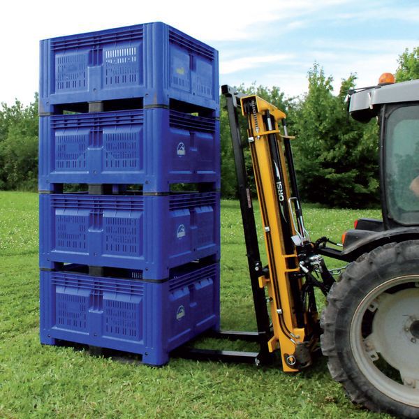 Backpack forklift is a kind of orchard transportation equipment developed to solve the problem of transporting fruit baskets and other orchard materials under off-road conditions in orchard mountainous areas, which is used in conjunction with orchard tractors. The forklift is mounted on the rear three-point suspension of the tractor, and the driver controls the forklift motion by operating the hydraulic control valve. The forklift has the functions of lifting, sideshift, tilting, and basket locking. It is equipped with 2 lifting cylinders, 1 tilt cylinder, 1 sideshift cylinder, and 2 locking cylinders, totaling 6. Multiple fruit boxes can be lifted at one time to facilitate the handling of materials such as orchard fruit boxes and save manpower and material resources. Orchard users do not need to purchase a mountain forklift separately. They can directly install the backpack forklift on the tractor to achieve mountain handling operations, which can be used wherever the tractor can go. It is especially suitable for the transfer of fruit boxes after picking in orchards.